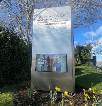Blackrock Health enhanced their Dublin clinic’s entrance with a totem sign that combines digital technology and traditional engineering, meeting high sustainability and visibility standards.